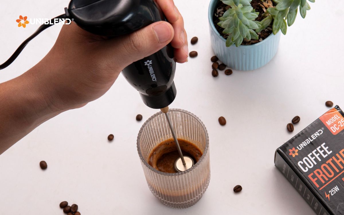 Tiếp theo, dùng cây đánh bọt Uniblend DC-201 để đánh bông hỗn hợp kem. Bạn đánh kem đến khi hỗn hợp có độ bông vừa phải, không quá đặc cũng không quá loãng, để có lớp kem mềm mịn, khi đổ lên ly bạc sỉu sẽ không bị chảy nhanh.