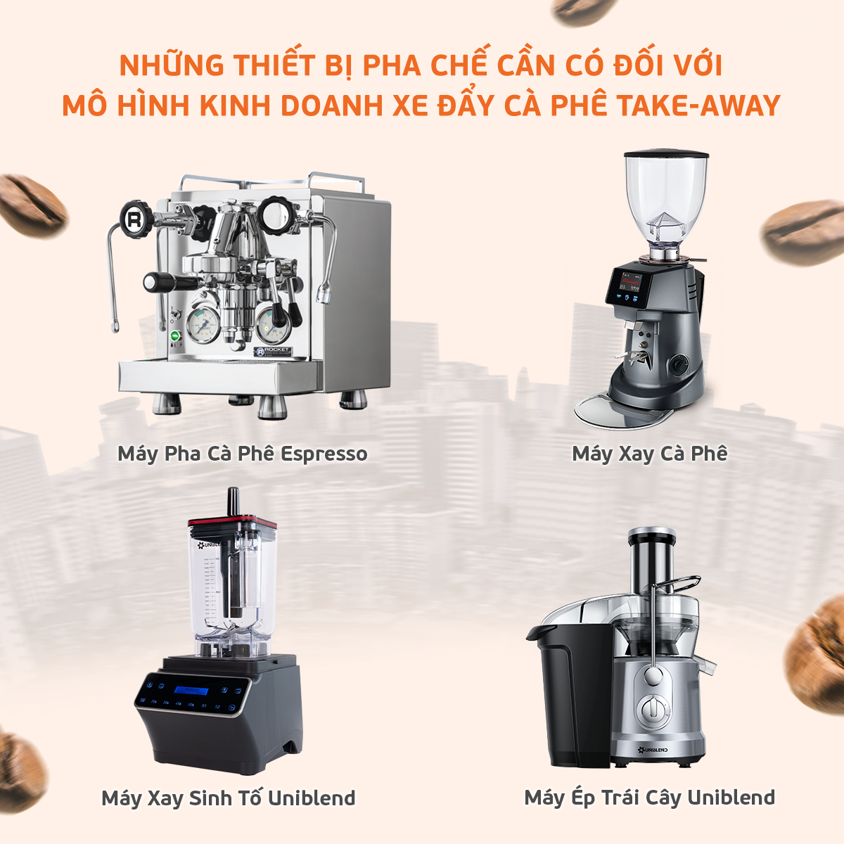 Để thành công trong mô hình xe cà phê take-away, bạn cần có các thiết bị pha chế chất lượng và hiệu quả. Dưới đây là danh sách các thiết bị quan trọng cần có: